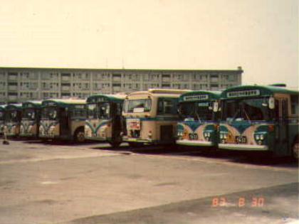 市電保存館ができた直後に市電保存館の中から撮影した写真です。当時私は小学校6年生でした。1983年8月ですので、まだこの時点では市営バスには富士重工の5Eタイプのボディーを持った車両は導入されていません(1983年10月くらいの導入でした)。まだまだ非冷房車が幅をきかせていた頃で、この写真を見ても右の2台の特定車(このページの対象車)以外はすべて非冷房車となっています。また、写真ではちょっとわかりにくいのですが一番左端の車両はこの頃はまだ在籍していた三菱車です。