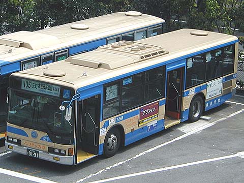 三菱ふそう車のノンステップ車です。正面にも「ノンステップバス」と書かれています。このボディーは1996年度車から投入されているのですが、ノンステップバスの場合、なんだか横長の顔つきとなっています。