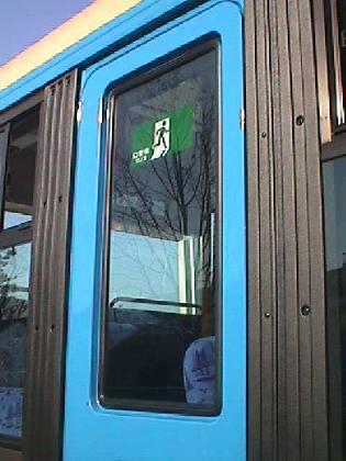 さて、4枚目の写真ですが非常口を表すステッカーです。この1998年度車から一般の建物内にあるものと同じようなマークに変更となりました(それまでは赤い文字で「非常口」と縦書き表記されていました)。