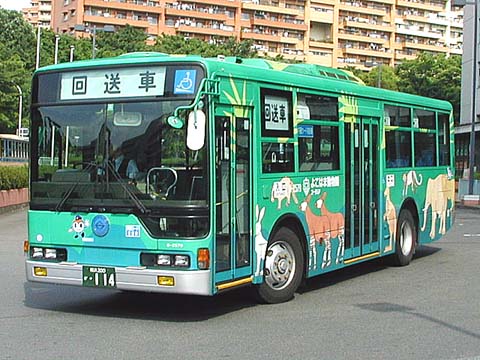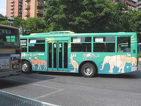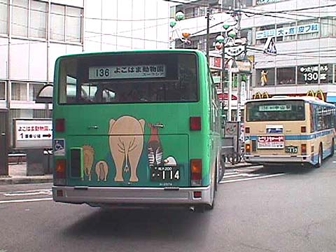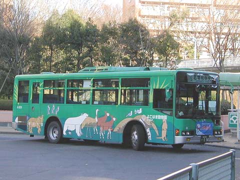 後ろ姿になってしまいましたが、若葉台営業所の「ズーラシア」PR塗装バスの写真です。この写真を撮影した日はよこはま動物園〜中山駅北口間の臨時バスに使用されていました。前の方からの写真は保土ヶ谷営業所の車両の写真で紹介しています。後ろ姿ということで描かれている動物も後ろを向いているのがポイントになっています。
