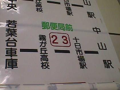 - 3枚目はまたまた23系統です。中山駅〜若葉台車庫です。若葉台車庫発着というバスは十日市場駅、青葉台駅方面のバスには設定があるのですが、中山駅については若葉台車庫発着便は(現在では)無いはずです。