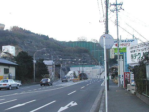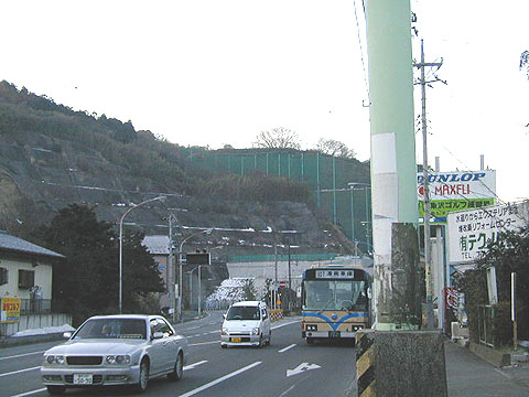 下は5年後の2001年の写真です。この通り「笹下釜利谷道路」は拡張工事が行われ、環状2号との交差点から金沢文庫方面までは片側2車線ずつに拡張されました。山を越えるトンネルは右側にもう一つトンネルが増設されました。現在栗木町方面に通じる道路(3枚目で107系統が走っている方向)はかつて折返場があったところです。折返場は廃止され、現在93系統は磯子台団地方面への循環線となりました。