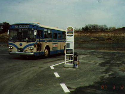 バスが出来てまもなくの1987年3月、新横浜駅から北山田まで乗ってみました。先に書いたとおりすみれが丘の近くということで貸切状態になることはありませんでした。この写真は今後「北山田の変遷」という所でも使用しますが、この当時は国道246号線から北山田、百石橋、そして綱島へ抜ける道路はまだ出来ていませんでした(現在の道路はこの写真の後方に当たります)。雨が降った後でここにやってきました。折返しまで10分以上あったのでバス停のまわりを歩いてすみれが丘の方まで行ったのですが、地面がぐちゃぐちゃで靴がかなり汚れてしまったことをよく覚えています。