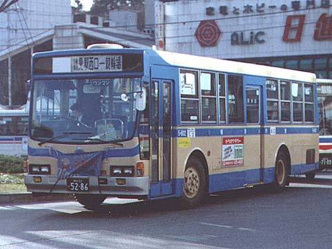 花月園送迎輸送の車両の写真です。以前はこのバスには49系統という系統番号がついていたのですが、1986(昭和61)年に一度急となり、その後系統番号がなくなった形で復活(休止期間が実際にあったのかは不明です)しました。無料のバスに系統番号をつけるのに問題があったのかもしれません。