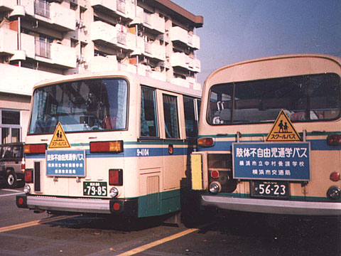 滝頭営業所のスクールバス(特定車)2台です。滝頭営業所には写真右側に写るタイプの車両が2台いましたが、1台は左に写る9−4104と入れ替わりで廃車になったようです。翌年にはもう1台新しい車両が入り、右の車両(0−4102)も廃車となっています。ちょうど過渡期の貴重な写真ですね。