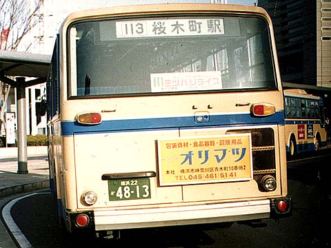 磯子営業所に最初に配属された5E車のうちの1台です。後に金沢派出所に移り、金沢暮らしの長かった車両と記憶しています。金沢派出所は主に61系統などの金沢地区の運用を担当していましたが、写真にあるような113系統をはじめ、(旧)81系統、99系統、110系統も担当していました。そんなわけで横浜駅や桜木町駅でも金沢所属の車両を見ることが出来ました。