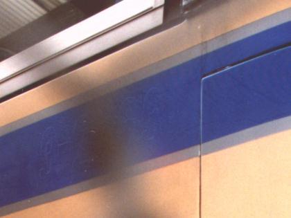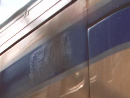 この時、確認できた廃車車両は3台でした。もう1台は9−2363の前におり、番号が確認できませんでした。 下の2枚の写真は番号をペンキで塗りつぶした様子を撮影したものです。真ん中の写真は少々わかりにくいですが、3枚目の写真では「9−2364」がある程度読みとれるのではないかなと思います。 ちなみに、これらの車両の車内吊り広告は掲載されたままでした。