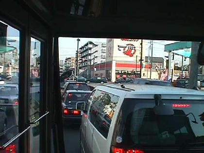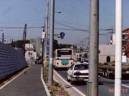 5枚目は現在(2000年2月)の写真です。303系統が乗り入れをはじめて14年、ここは大きく変化しました。正面の交差点は北山田の交差点です。写真の中央に写るお店が当時の折返場の場所になります。4枚目の写真を撮影した年の夏にも一度この場所は通過しているのですが、それからの5年間でずいぶん整備されてしまいました(2000,02,06:写真変更)。